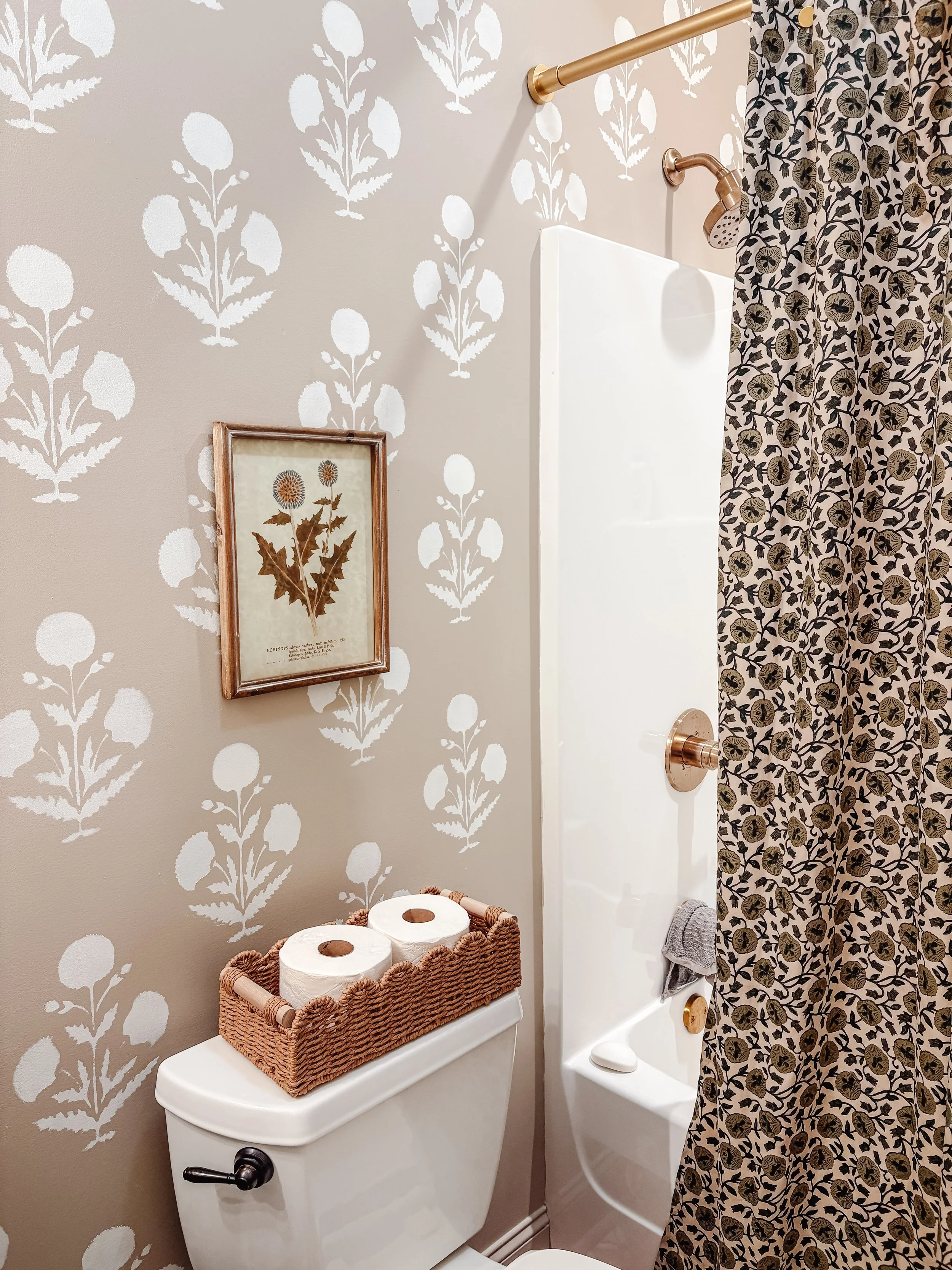 We added a new brushed gold tension rod and a dramatic floral curtain in a darker palette to tie together the tones of the vanity and floor. The heavier pattern balances the bright stencil and gives the space a cozy, high-end feel. Curtains are often overlooked in bathroom design, but they can completely shift the tone. A patterned curtain helps define the space and adds softness without sacrificing function.
